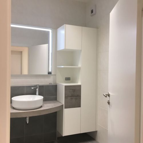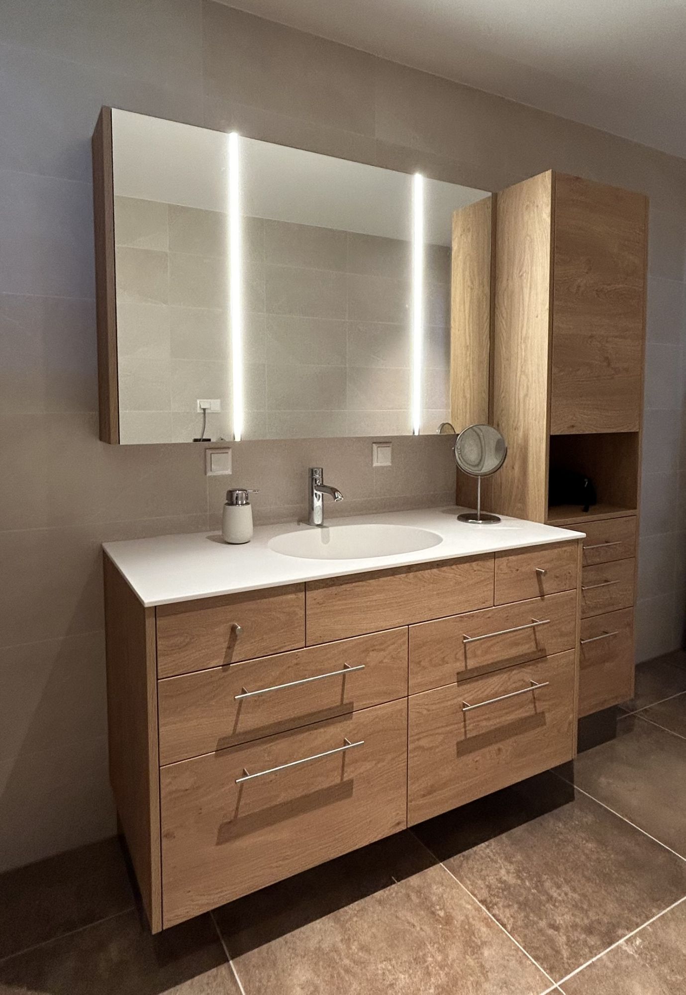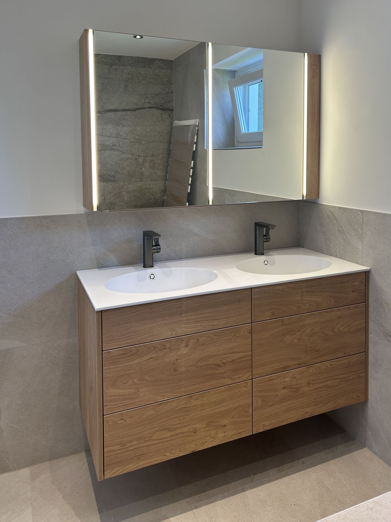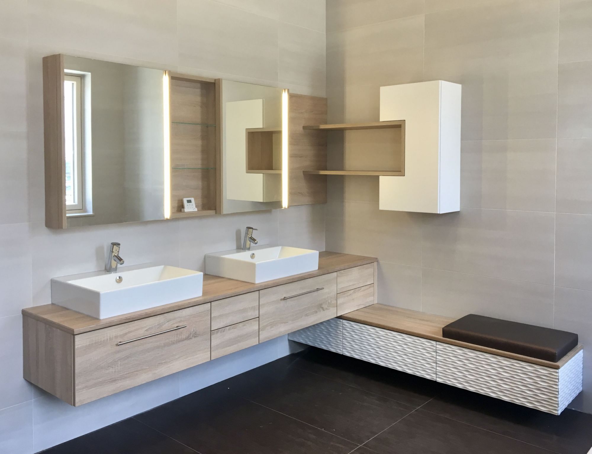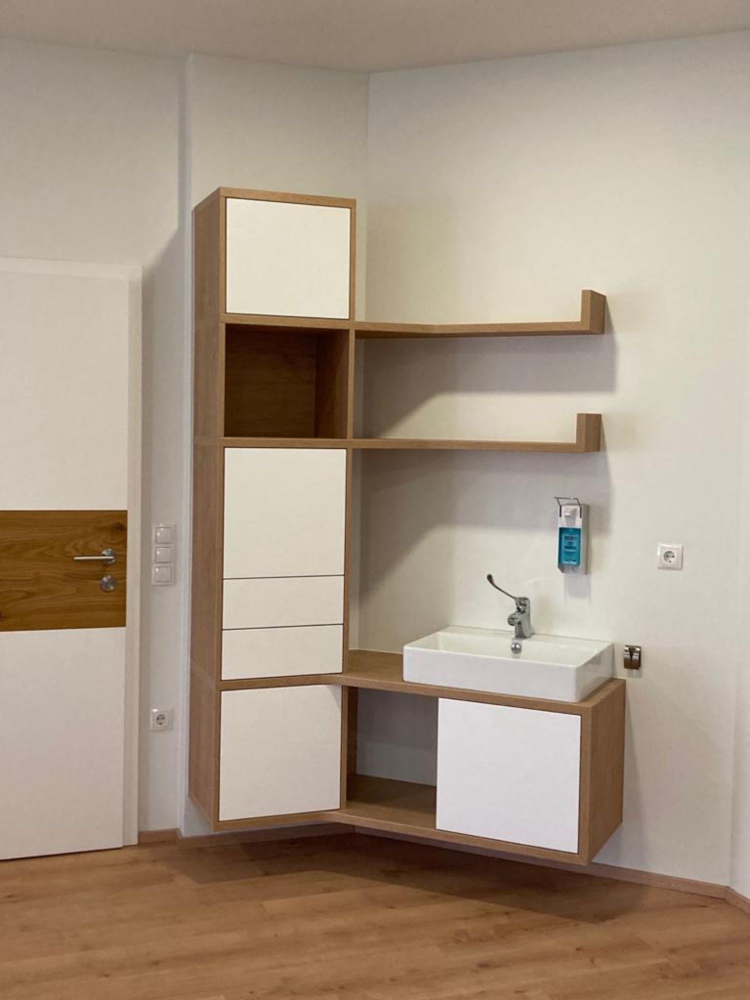 Vom Waschtisch über Spiegelschränke bis hin zu Ablagen oder Verkleidungen – jedes Stück wird präzise geplant und an die räumlichen Gegebenheiten angepasst. Wir verwenden feuchtigkeitsbeständige, hochwertige Materialien, die sich ideal für den Einsatz im Nassbereich eignen und zugleich eine natürliche Eleganz ausstrahlen.