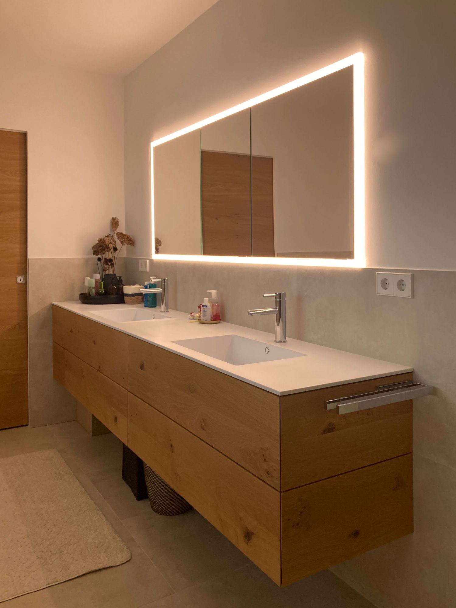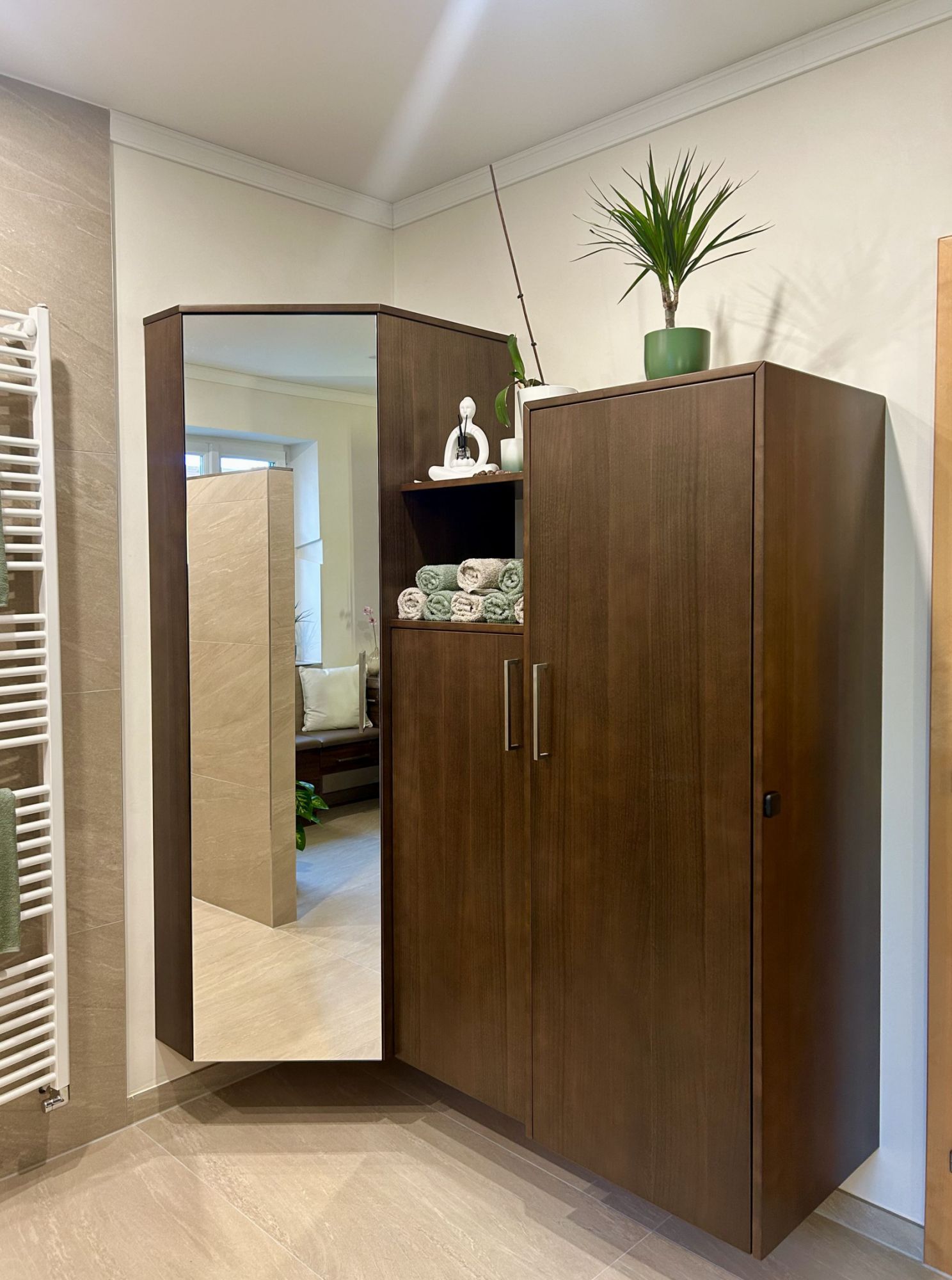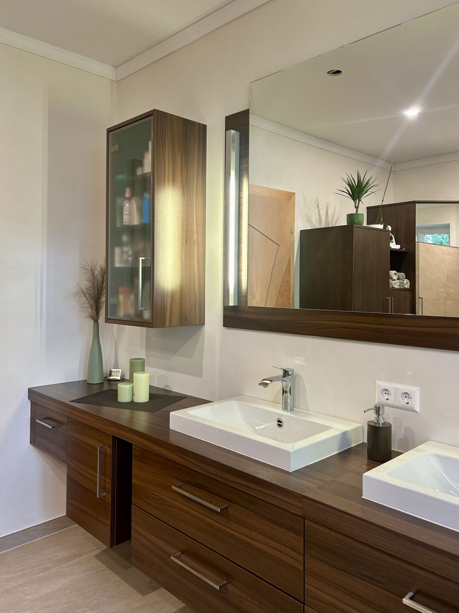 Ein Badezimmer aus Holz schafft eine Atmosphäre von Wärme, Ruhe und Natürlichkeit. Unsere Tischlerei fertigt maßgeschneiderte Badmöbel, die Funktionalität und Design harmonisch vereinen.