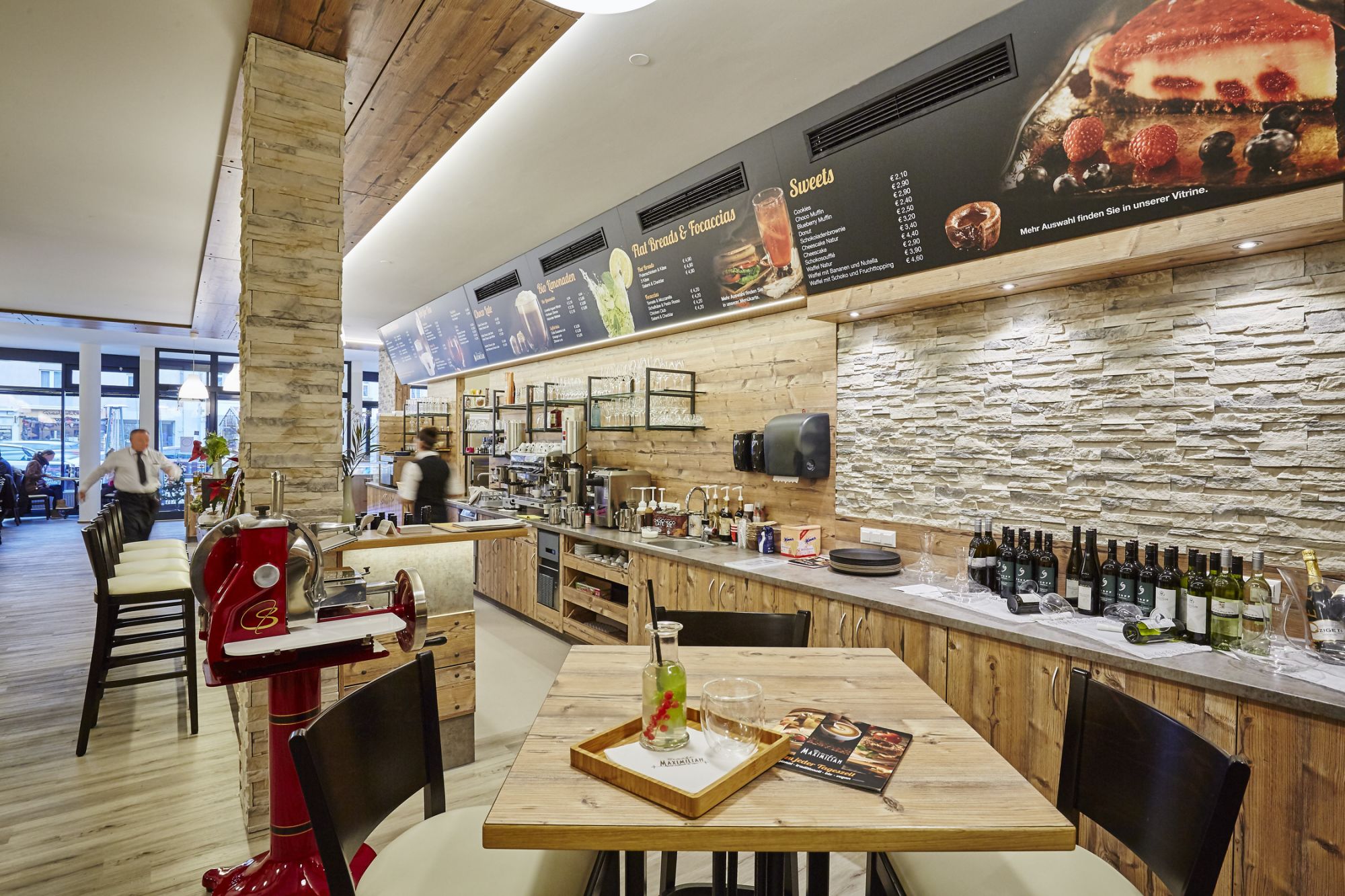 Der Vinylboden in Holzoptik wurde als strapazierfähige und pflegeleichte Lösung gewählt. Er vermittelt die warme Ausstrahlung eines Holzbodens, ist jedoch robust genug, um dem regen Publikumsverkehr standzuhalten. Tische und Thekenelemente bestehen aus Holz und greifen die natürliche Farbwelt der Wandgestaltung auf.