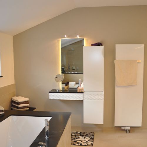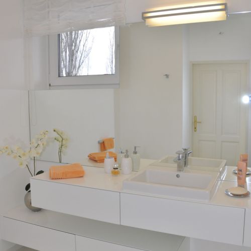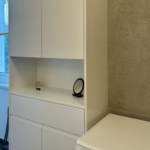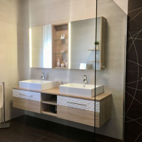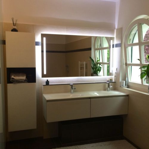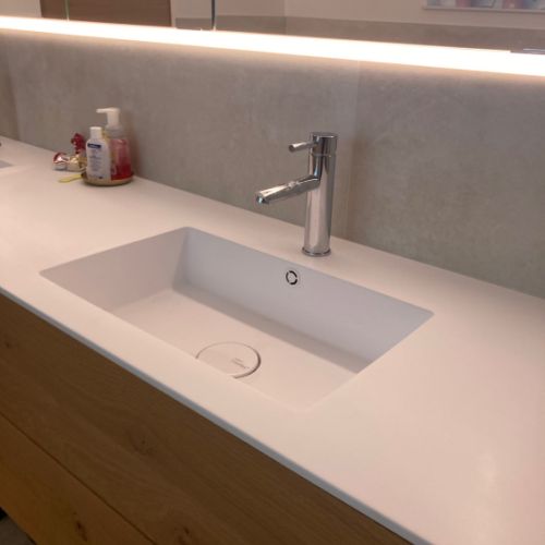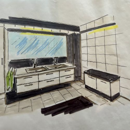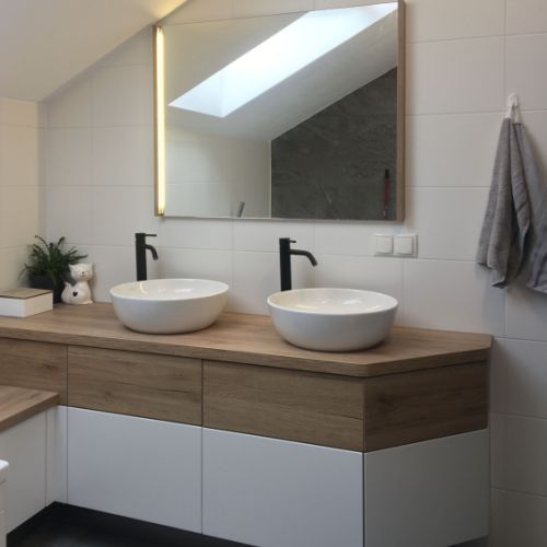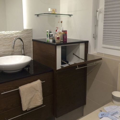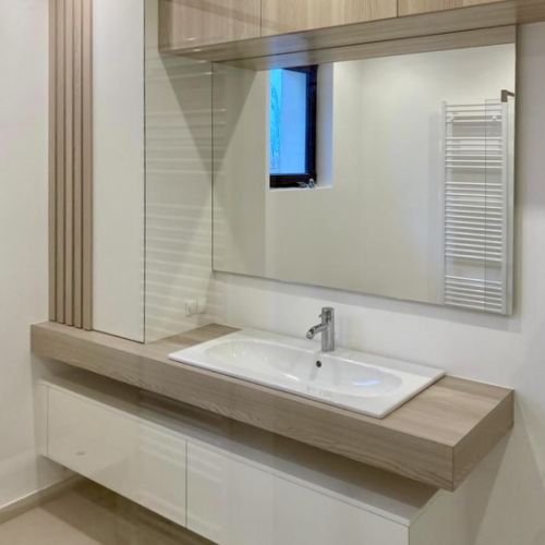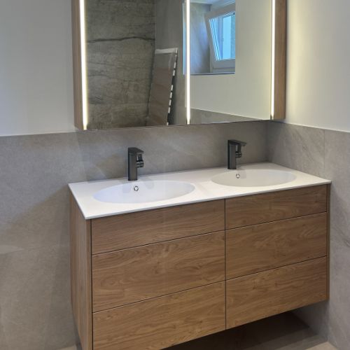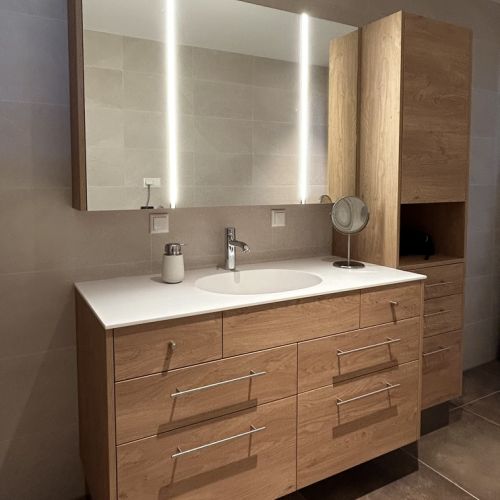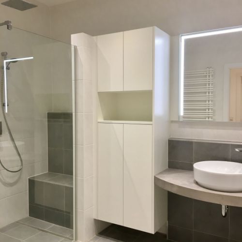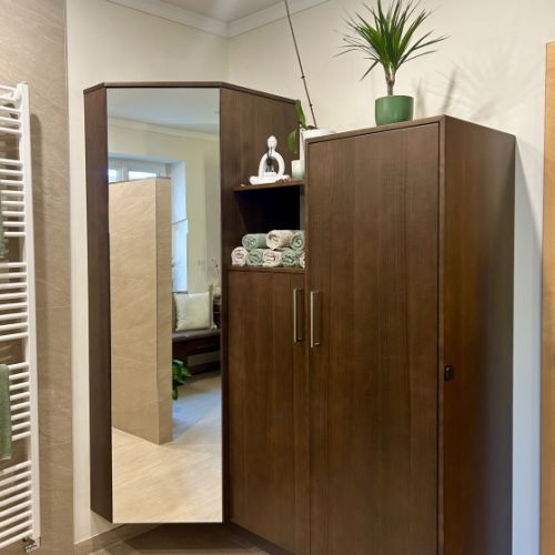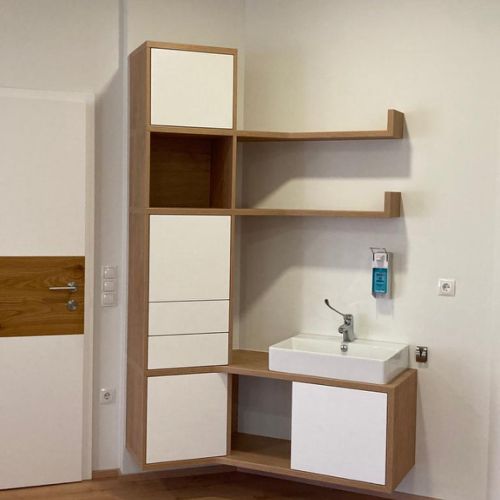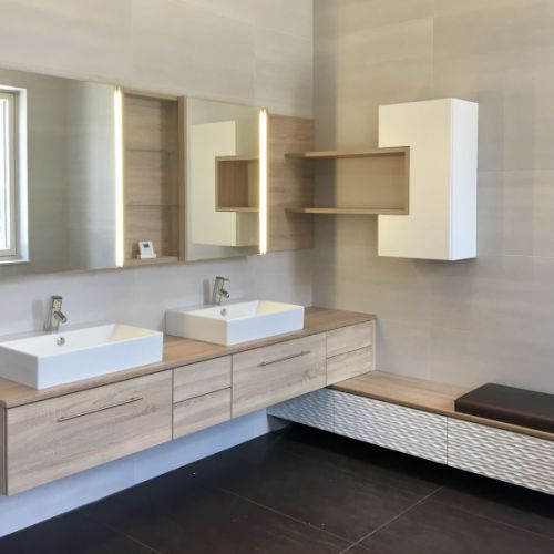 Vom Waschtisch über Spiegelschränke bis hin zu Ablagen oder Verkleidungen – jedes Stück wird präzise geplant und an die räumlichen Gegebenheiten angepasst. Wir verwenden feuchtigkeitsbeständige, hochwertige Materialien, die sich ideal für den Einsatz im Nassbereich eignen und zugleich eine natürliche Eleganz ausstrahlen.