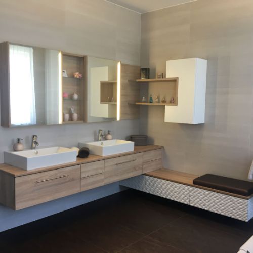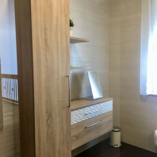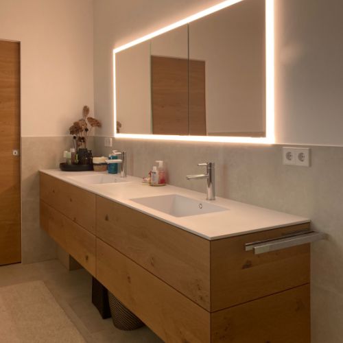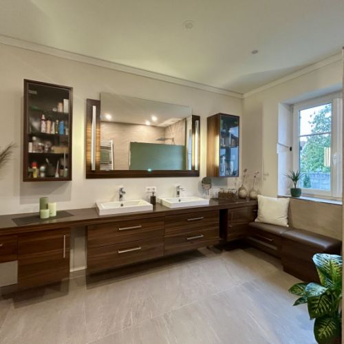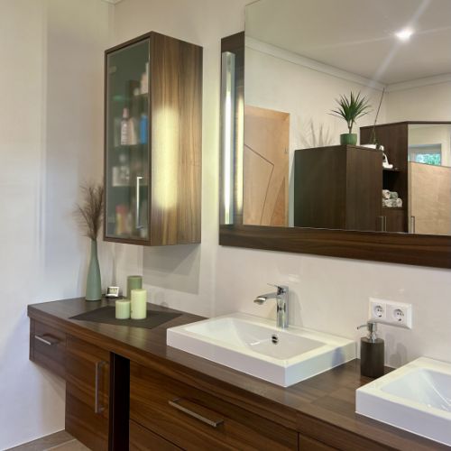 Ein Badezimmer aus Holz schafft eine Atmosphäre von Wärme, Ruhe und Natürlichkeit. Unsere Tischlerei fertigt maßgeschneiderte Badmöbel, die Funktionalität und Design harmonisch vereinen.