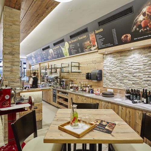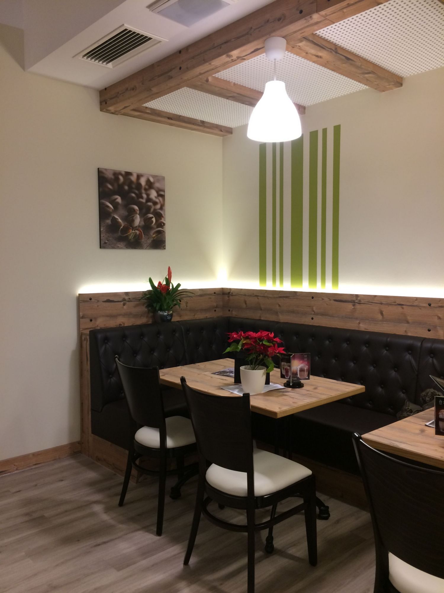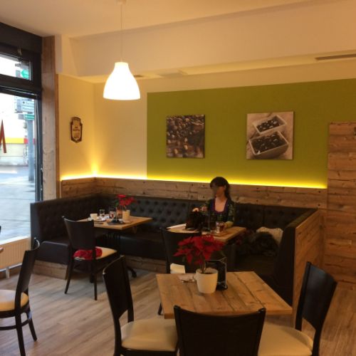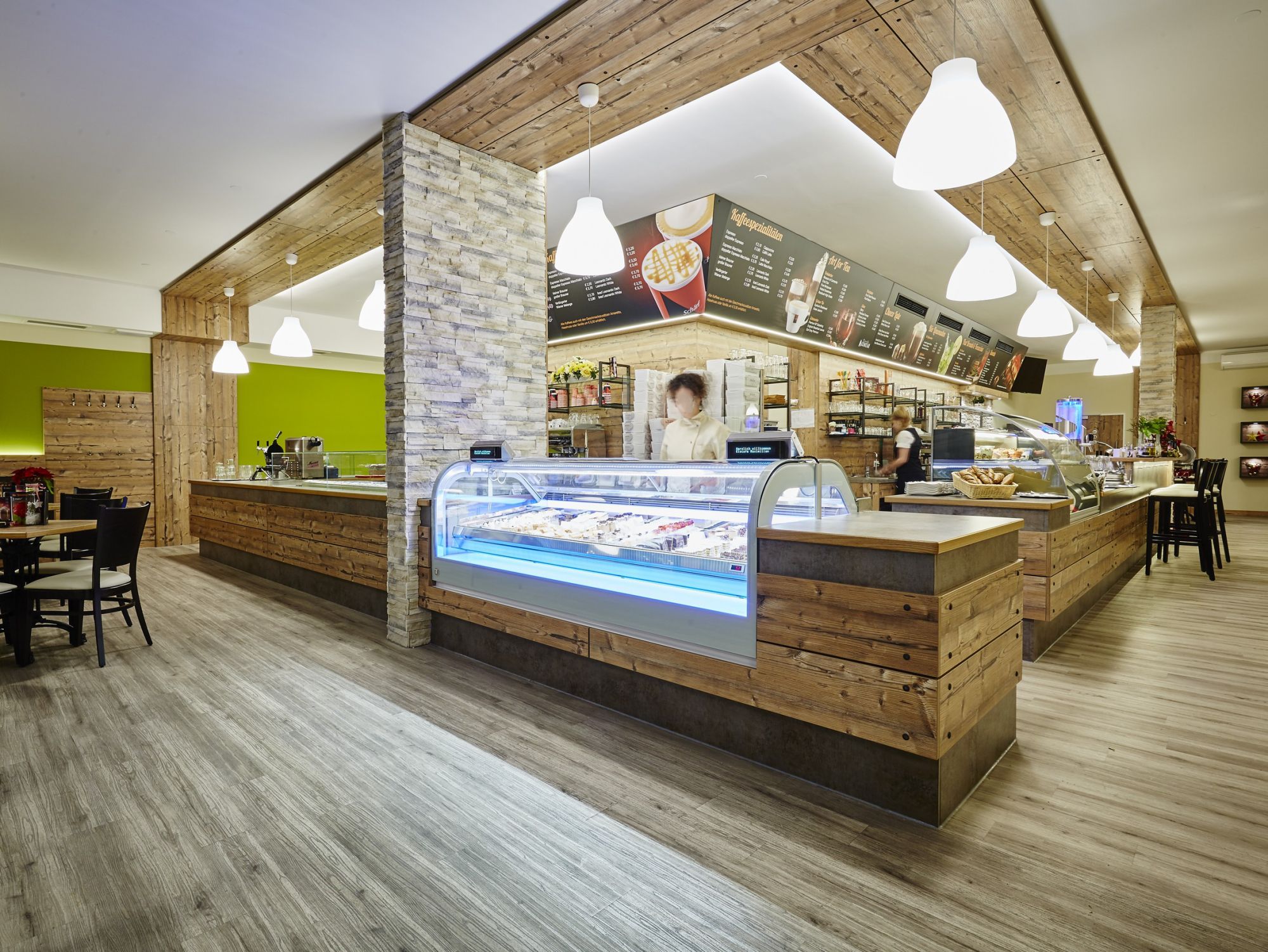 Der Vinylboden in Holzoptik wurde als strapazierfähige und pflegeleichte Lösung gewählt. Er vermittelt die warme Ausstrahlung eines Holzbodens, ist jedoch robust genug, um dem regen Publikumsverkehr standzuhalten. Tische und Thekenelemente bestehen aus Holz und greifen die natürliche Farbwelt der Wandgestaltung auf.