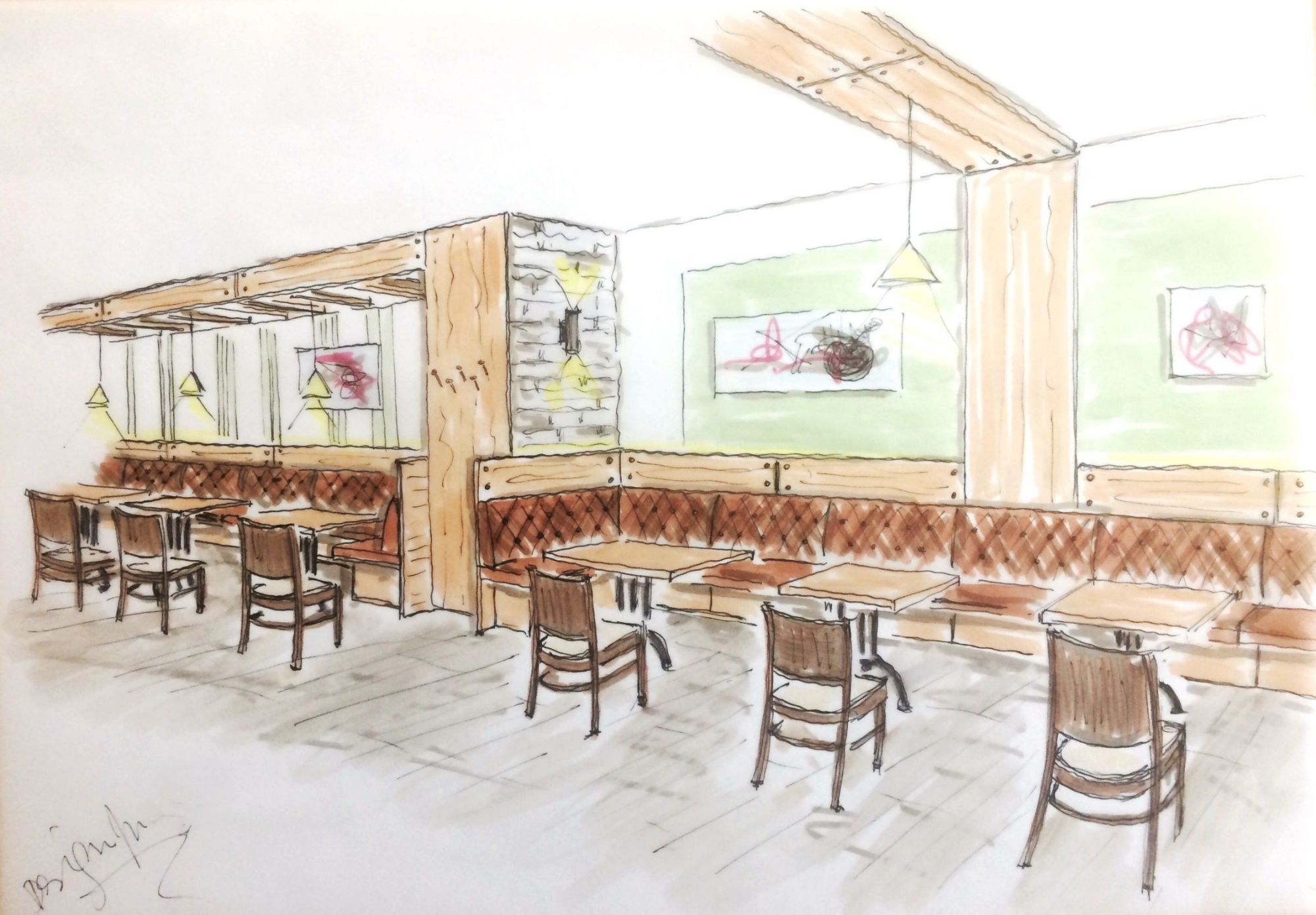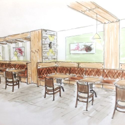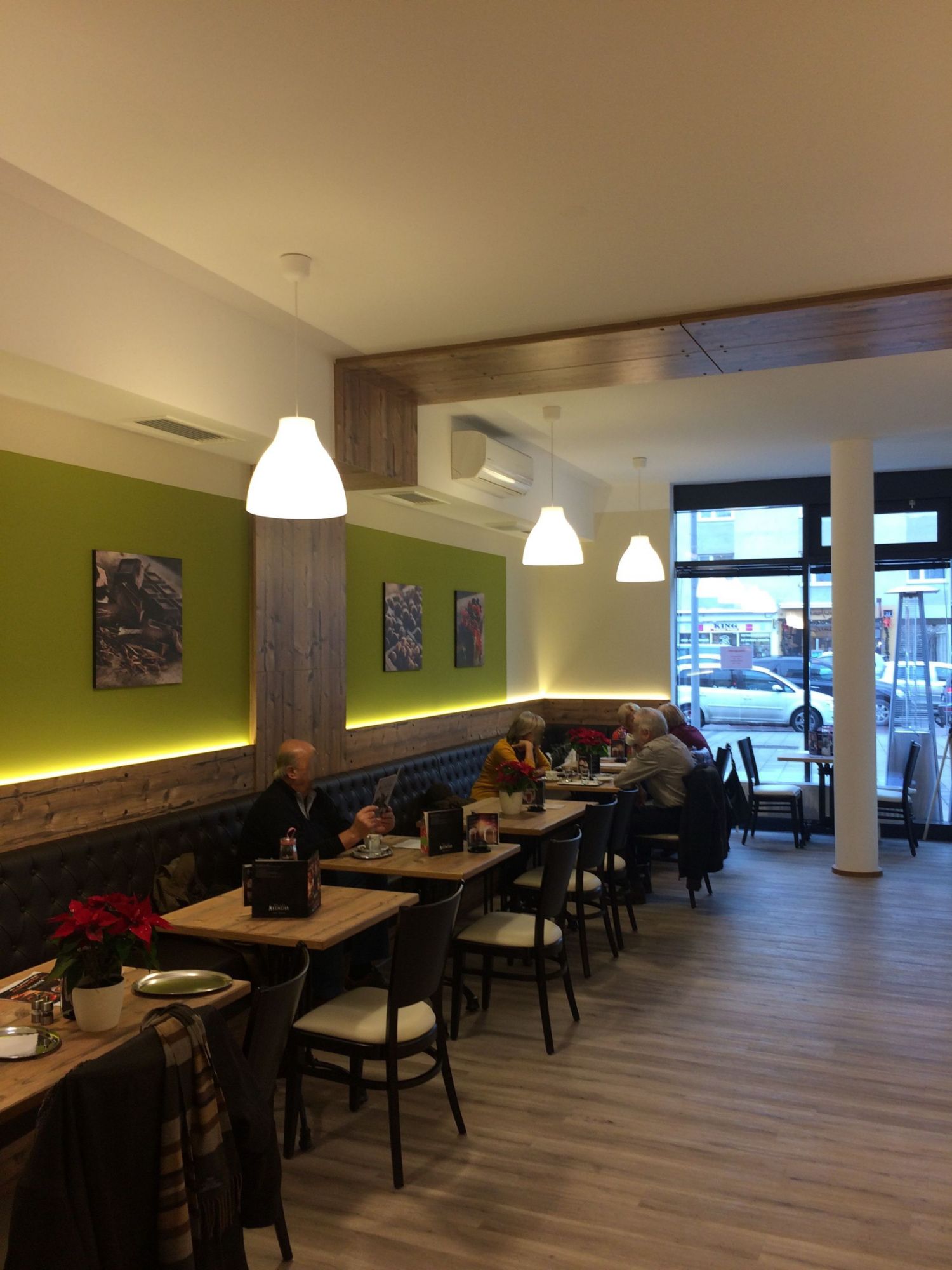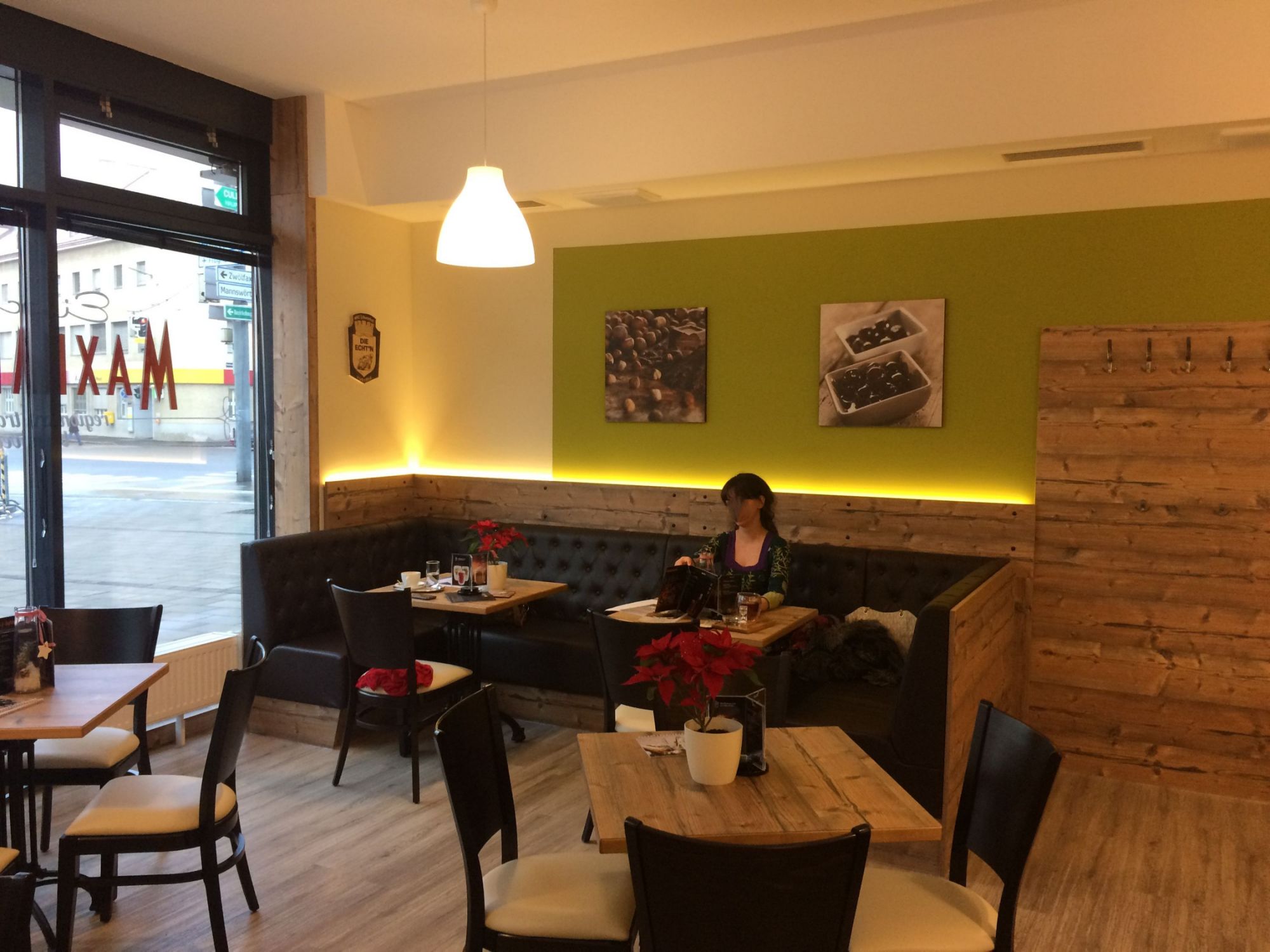 Der Vinylboden in Holzoptik wurde als strapazierfähige und pflegeleichte Lösung gewählt. Er vermittelt die warme Ausstrahlung eines Holzbodens, ist jedoch robust genug, um dem regen Publikumsverkehr standzuhalten. Tische und Thekenelemente bestehen aus Holz und greifen die natürliche Farbwelt der Wandgestaltung auf.